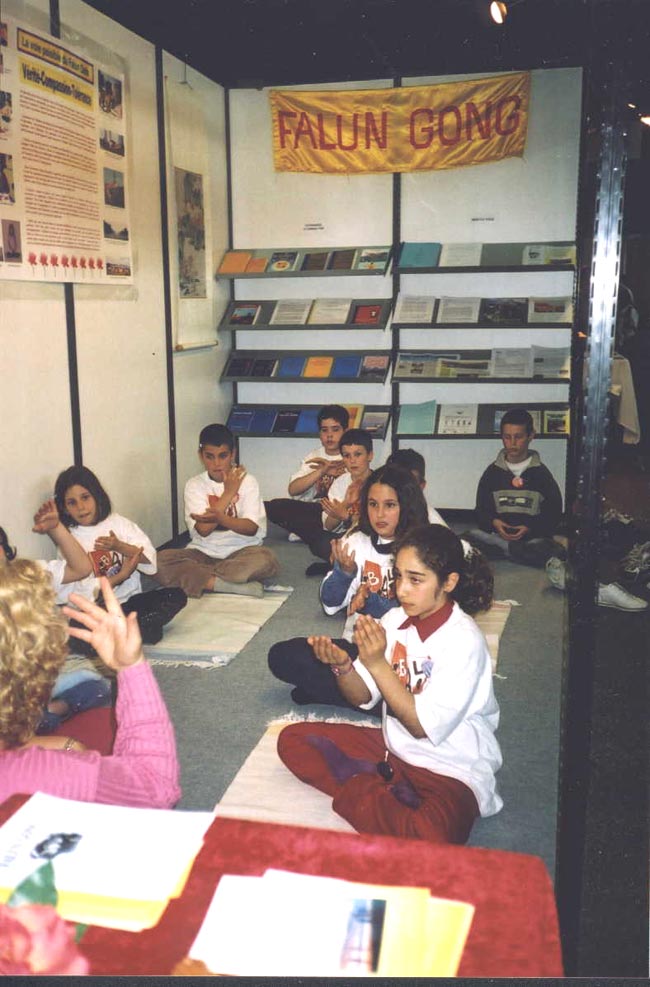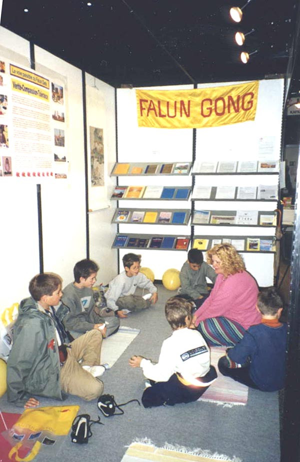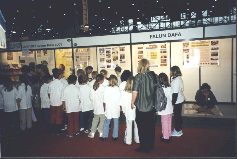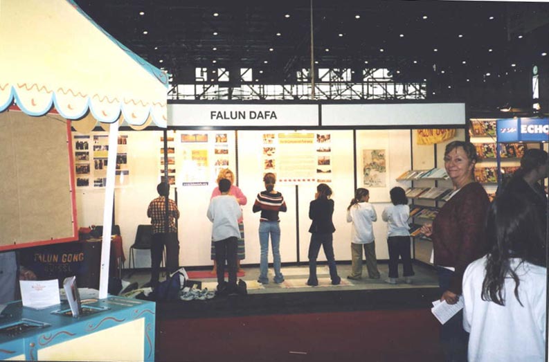 | 【明慧网2002年5月18日】5月1日至5日,一年一度规模宏大的日内瓦国际书展在日内瓦Palexbo展览中心举行。这是全瑞士最大的国际图书展,观众达十几万人以上,这给我们提供了绝好的洪法机会。 象前两年一样,瑞士弟子租了摊位,展示大法图片及各种文本的大法书籍,并连续进行功法表演,每天都吸引了大批观众,成为书展中独特的一景。经过两年多来持续不断的讲真相,法轮功及在中国被迫害的情况已几乎尽人皆知。当观众们从展台前经过时,往往情不自禁脱口而出:“噢!是法轮功!”人们渴望更多的了解法轮功本身,许多观众停下来,主动与大法弟子们交谈。据出版商反映:今年法文版《转法轮》和《法轮功》的销售比去年明显增加。