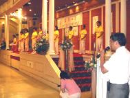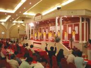 | 【明慧网二零零二年六月二十五日】六月二十二日台湾心会成立新竹分会,法轮功学员应副总统吕秀莲之邀,在新竹市华丽雅致宴会厅上向在座的教授学者们作十五分钟的功法表演。整个表演过程中,吕副总统及与会者都非常专注的看着,有人甚至立即在台下跟着学炼了起来。 当炼功音乐声响起,全场立即安静无声,整个大厅沐浴在一片祥和的气氛当中,与会出席的150几位专家学者们,无不专注聆赏,整个会场弥漫在大法「真、善、忍」的庄严祥和之场中,非常感人。  学员在台上炼功十五分钟的表演时间里,两位学员穿插介绍五套功法法理,并说明大法是以「真、善、忍」为标准的性命双修功法,修心为主、炼功为辅,台湾目前有七百多个炼功点,大法洪传五十几个国家,全世界约一亿人学炼,《转法轮》等书翻译成二十几种语言等等。另有两位学员发送大法简介与光碟,内含修炼故事与江集团迫害法轮功真相。 台湾心会是以学者专家为主的团体,新竹分会成立大会上,除了来自全国各地心会代表外,主要是交通大学与清华大学教授,以及新竹科学园区的专家们,包括交大校长,超过一百五十人。学员带去的简介,当场发完,还有许多向隅者。整个表演过程中,吕副总统及与会者都非常专注地看着,有人甚至立即在台下跟着学炼了起来。  清华大学教授表演开始前,我们就听到有教授们说:今天终于可以看到法轮功的表演了,他们早已等了许久。吕副总统在致词时也提到:人心要是好的,社会就会变好。 法轮大法修炼首重就是人心,这场短短的十五分钟演出中,学员们都被感动了,就如同修报告中所说「生命需要真、善、忍,世界也需要真、善、忍」,我想如果全人类的心中都充满了「真、善、忍」,世界将会是怎样的美好啊! (英文版:http://www.clearwisdom.net/emh/articles/2002/6/29/23586.html)