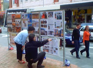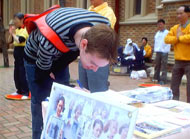 星期六,正逢7.20,西澳大法学员征得微斯理教堂(Wesley Church)的同意,在他们市中心的教堂外举行洪法及揭露邪恶的活动。此地位于市中心的外围,人潮不少,还有许多游客到此观光。 一早,负责准备材料的学员便预备好了一天洪法讲真象的材料,有传单、VCD,及大型图片展。今天约有十名左右学员参加,有从台湾、新加坡、中国、马来西亚等地移民到西澳定居的学员。 我们一行人,分工合作,有人打坐炼功,有的灌气球赠送给小孩们,有人发传单;而英语好的学员见到有人驻足围观,便主动上前讲清真象。我遇到一名从奥地利来澳洲旅游的华裔女孩。她表示曾听说过法轮功但不甚清楚,我给了她一些大法资料并介绍她欧洲的圆明网网址。她相当感兴趣并停留观看图片许久。 当地的澳洲人看到迫害的图片及讯息后,纷纷主动上前在请愿单上签名。不少人因此次的活动而得知了大法。 有一名马来西亚华人,因受邪恶谎言的蒙蔽,态度不甚友善。有些问题,因为我一时回答不上。我赶快找了另一位学员解围。学员针对他的心结,耐心地解释了一些问题。良久,此名华人的态度已见改善。我在他走之前递给了他一片VCD光盘。希望他能理智判断是非,从而消除对大法的误解。 今天虽然阴云满布,一位学员说天气预报下午会下雨,却一直没下成。结果天气异常温和,此应归功于当地大法弟子的发正念和感谢师父的加持。 (英文版:http://www.clearwisdom.net/emh/articles/2002/7/25/24478.html) |