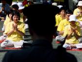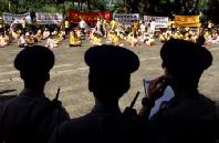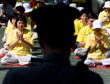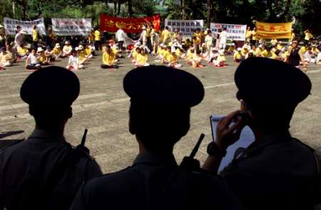 【明慧网2002年7月4日】法新社7月3日转载英文南华早报报导,中国国家主席江泽民日前出席香港回归五周年庆典发表演说的实况转播,因担心遭法轮功插播而临时取消直播。报导说,国营的中国中央电视台和香港凤凰中文台取消转播江泽民演说及香港特区行政长官董建华及其新内阁七月一日的宣誓就职仪式。   7月3日,警察注视着香港及海外法轮功学员抗议香港政府用黑名单阻止法轮功学员入境。南华早报引述业界消息报导说,北京当局担心法轮功成员可能会切断转播并插播支持法轮功的讯息。 报导说法轮功曾多次成功拦截中国电视台的播送,最近一次是在上周劫持一个广播卫星供传送法轮功的讯息和影像。 南华早报指出,中国公安对法轮功上周如何设法拦截卫星广播「大感困惑」,怀疑是外国所为或利用装设在中国境内移动车辆上的高科技设备以逃避侦测。 报导说在前述庆典中,临时抽掉实况转播,是为了避免抵香港出席庆典的江泽民遭到任何难堪。
