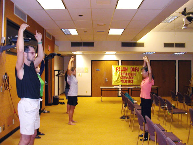 【明慧网2002年9月19日】爱荷华市是爱荷华州几大城市之一,如何向那里的人们洪法一直是我们时常思考的问题。2002年9月15日,我们在爱荷华市举办了两个小时的介绍法轮大法的洪法班。来参加的有当地的居民和学生。他们中有的以前在华盛顿DC学了炼功动作,也有的看过《转法轮》。两个小时中,我们介绍了大法的十年洪传,播放了录像片并教功。活动结束后,人们主动组织在当地建立炼功点,并且在敦促布什总统在江来美国期间讨论法轮功人权的明信片上签名。