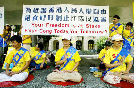 路透社图片报导:香港法轮功学员在8月份的绝食请愿中发正念