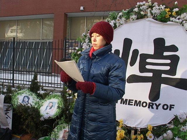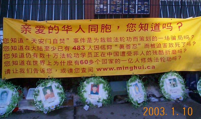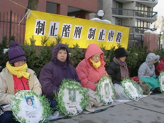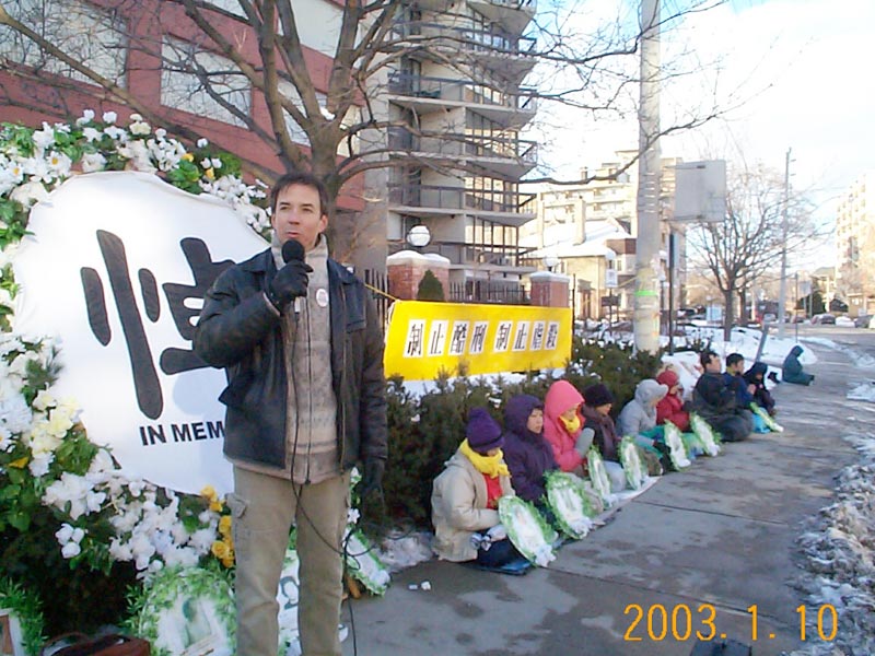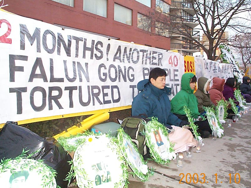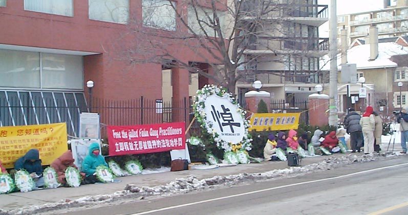 和全球五十多个国家的法轮功学员同步,多伦多法轮功学员于一月十二日上午九点开始,在中国驻多伦多领事馆前举行了一整天的静坐活动,揭露江罗集团在近两个月来对中国大陆的法轮功修炼人犯下的新罪行。在两个月中,在海外已得到报道的被江罗集团杀害的法轮功学员人数已高达四十三人之多。