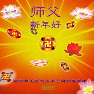 尊敬的师父:您好! 在2003年春节到来之际,长春大法弟子(包括被非法关押)大法弟子想念您,问您一声春节好! 在这师恩浩荡,正法突飞猛进的岁月里,师父您为弟子、为救度众生耗尽了自己的一切。师尊您辛苦了。 此时我们再次向师尊致以无限的敬意。我们难以用语言表达心中的感激。师父,弟子们愿以正念正行走好正路上的每一步。紧跟师父救度众生。 藏头诗:长春大法弟子问师父新年好
