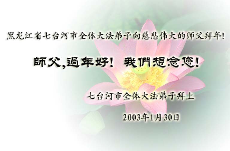 师父,过年好!我们想念您! 七台河市全体大法弟子拜上2003年1月30日 开封弟子向师尊拜年!