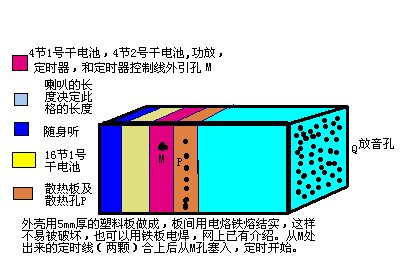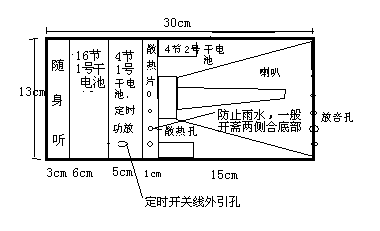 【明慧网2003年11月28日】在长途汽车或公共汽车上可采用低功率的小喇叭定时播放。实物体积约13x13x16立方厘米,用6节一号干电池供电,总价40元左右;而在集市、居民区、校园或广场、劳教所等地方播放时要用功率较大的喇叭,自己制作只需要60元左右,体积在13x13x30立方厘米,采用10对一号干电池供电。