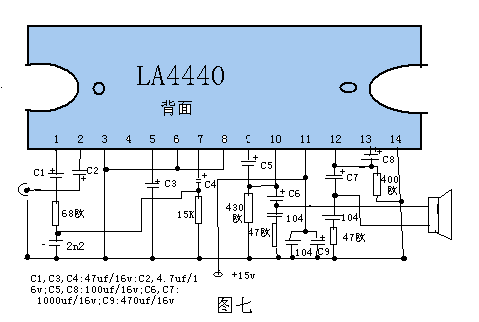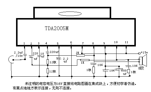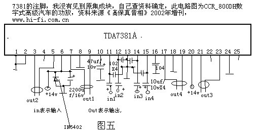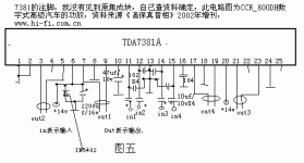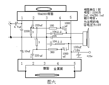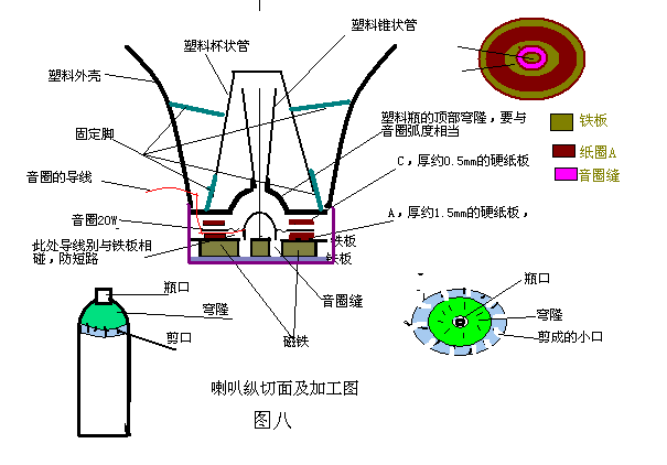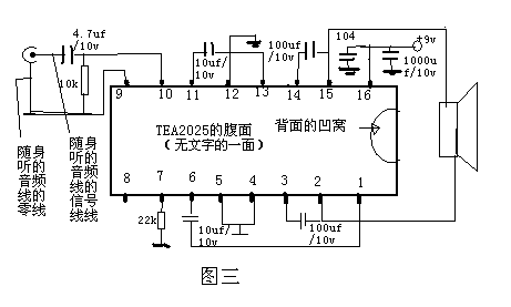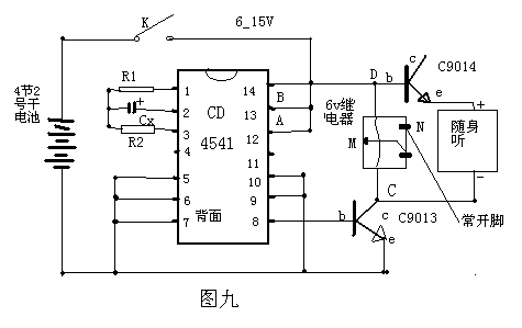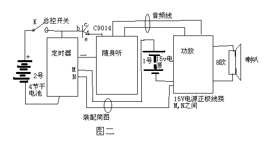 一)组装实物图及简图如图一和图二。二)自动翻面随身听,价格20元左右。打开随身听的后盖将4颗导线(两颗信号线,两颗电源线)接出,在电源线的正极接C9014的发射极或者集电极,在C9014基极接一颗红导线,电源负极用黑导线,音频线的地线用白导线,信号线用黄的。还可在电源两线之间加接一个1000uF/6.5v的电容器,降低噪音。注意,有些随身听的音频线的地线与电源正极相通,此时随身听的自带扬声器或耳机有电流通过,供其末级功放供电,如果取掉随身听的扬声器,则必须在音频线的两线之间接一个相当于扬声器的电阻(8欧),否则,末级功放无电,则无信号输出。 三)此处介绍两种功放,TEA2025,TDA2005M。简要介绍TDA2003,LA4440。为方便仿制,电路图直接画在集成块上,集成块的脚命名方法是:有字面朝上,脚朝向自己,从左到右为1,2,3,4…… ⑴TEA2025,2元一块,电路图如图三。电源用6节1号干电池,为市场上25瓦喊话器的功放集成块。此处组成BTL电路,负载4欧时输出功率达到8瓦,适合在长途车等封闭环境使用。操作时,可将电阻电容直接焊在集成块上,然后在集成块背面涂上导热硅脂。固定在一小块铝片上,导热用。可与TEA2025直接替换的有LA4182、4183;SL4182;TDA4190、4550等。 ⑵TDA2005M,5.7元一块,电路图如图四。TDA2005有两种型号TDA2005S和TDA2005M,前者适合于双声道功放,后者适合于组成BTL电路,二者参数不同。TDA2005M负载8欧,电源用10对一号干电池串联成15V时,输出功率可达20—21瓦。 附3,TDA7381A是一种高保真优选功放,电路图如图五。负载8欧时不失真输出功达到100瓦(25瓦×4ch),外围元件少,可用4个扬声器四方广播,电源用电池串联或电瓶,可用4节一号电池并联再串联成15V,如果能购买到TDA7381建议使用。TDA2003,3元一块,如图六。LA4440,10元一块,如图七。前者在10对一号干电池串联成15V时负载8欧时,输出功率达18瓦,后者则可达21瓦,此处介绍的都是BTL电路,而且性能较佳。 五)自制广播喇叭,如图八。 ⑴选材:40W~60W,80w~100W的音箱喇叭,其磁铁大小相当于15瓦~25瓦广播喇叭的磁铁。价格在10元左右,旧的亦可,此处只用其磁铁部分。先购买一个音箱喇叭取其音圈,根据音圈大小去购买广播高音音圈(2元一个)。市场上有20瓦的音圈相当;适量的塑料板;万能胶101或者502等(502不能粘纸板),制作如下。 注:A、C硬纸板要选择相当结实的纸板。 ⑵先按照音圈大小剪好A、C圆圈(其内径比音圈波纹外径达2-3mm),然后将A板用胶水粘在磁铁上,(一定要粘结实),A板的内外圆与磁铁圆心重合(同心圆)。 ⑶将音圈放在纸板上试一试,在音圈导线下方的铁板上涂上绝缘胶(可用白乳胶代替),防止音圈工作时导线与铁板接触短路。胶干以后再将音圈放上,用手按住音圈膜左右移动,使音圈的导线组(音膜下方的圆筒)刚好落在音圈缝里。压住音圈,接入随身听的音频线,听有无摩擦声。放平稳后用胶水粘在A板上。 ⑷找一个厚塑料瓶(洗涤灵等),剪下瓶顶穹隆部,(如图八所示),剪口的地方剪几条缝(缝的长度等于纸圈A的宽度),如图八所示压平,剪口压平后内外径与纸圈一样, 用万能胶将B纸圈粘在剪口的下部;将此集合体粘在音圈上。这样发音部分即完成。用万能胶在外面涂上一层,保证结实。 ⑸将做好的圆锥筒E插入瓶口,粘实,再将F罩在E上,别与E相碰,再将F的3个脚粘或焊在塑料外壳G上,再将G粘在磁铁上。将音圈的导线从G底部接出来。喇叭即做成。 ⑹注意,E、F、G的角度相继越大,G越大,扬声器传播距离和覆盖面越大。粘结过程一定要粘结实。这样做出的高音喇叭与市场上购买的相当,而且,价格在15元左右,省去喇叭的大笔费用。 六)定时器:如图九。用CD4541定时(网上已有介绍),用途广泛,价格低效果好。其定时成立条件为: R2=2R1,计算公式T(s)=2.3nR1(欧)Cx(法),为方便计算化简如下:定R1为150k,Cx为变量。图九中A、B取负,n=4096,T(min)=23.55×Cx;A、B取正时,n=32768,T(hour)=3.14×Cx;A取正、B取负,n=128,T(min)=0.74×Cx;A取负、B取正,n=512,T(min)=2.94×Cx 。原理:CD4541是计数定时器,设定Cx后,电源接通开始计数,到设定时间后,从8脚输出脉冲信号,使C9013导通,继电器与随身听开始工作,继电器导通使功放通电,喇叭工作。注意:此处定时电路与随声听采用同一电源供电,因此用一个C9014接入,起降压作用,即中间脚与D相通,发射极连随声听正极,K为控制开关。第8脚不宜用C9014,其过流不如C9013大,随身听工作时电流在0.2-0.6A之间。悬挂条幅时,自己将D、C连接,电源用8节7号电池串联,在C9013体部拴上尼龙绳,到时C9013烧断尼龙绳,条幅脱落。C9013还可以点燃引线,使爆竹炸开箱子散发传单,吸引注意。 七)高压线悬挂喇叭或条幅的方法: