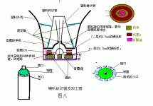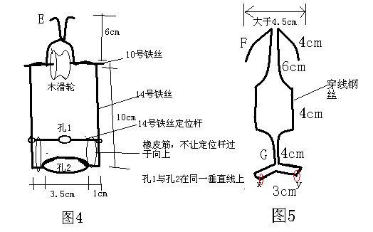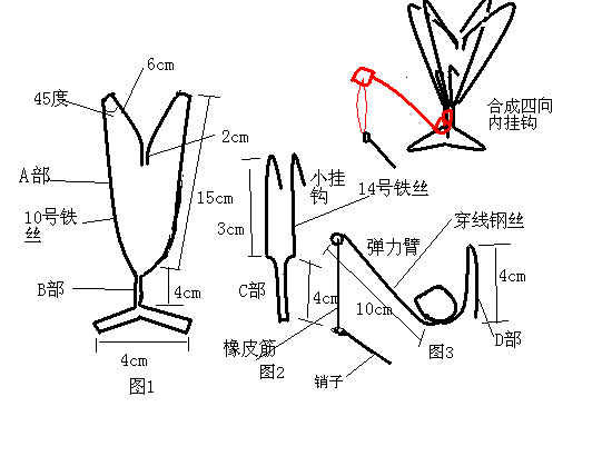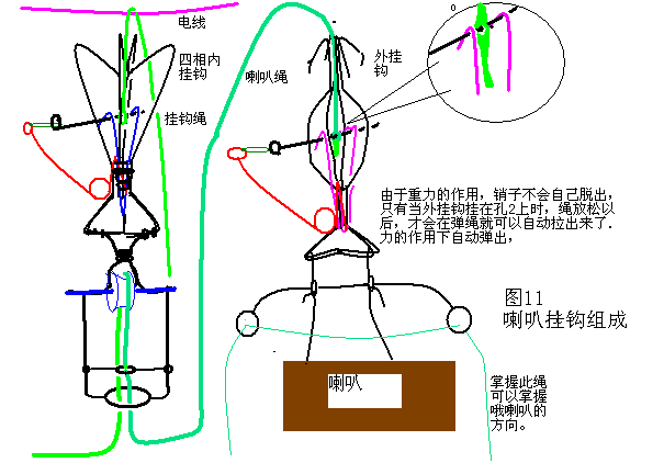 1)用约62cm 的10号铁丝制作成如图1所示形状,然后将两个图1叠合,四根向上伸的铁丝组合成四个方向的内挂钩。 2)取一根14号铁丝制作成如图2所示形状,将其C部与图1所示B部合在一起,使其两钩各在A部的对称相邻两钩之间。 3)取一根穿线钢丝(直径1.2毫米)制作成如图3所示,将其D部固定在B部,图3的弹性要把握好。弹力臂与图2的两钩在一个平面上,在弹力臂末端的小孔内穿一橡皮筋与销子连结。销子长约4cm(钢丝或铁丝),一端光滑(不带毛刺),一端弯一个小圈。 4)再取14号铁丝组成如图4所示的结构,滑轮可以用木头自己制作,轴用10号铁丝,定位杆用14号铁丝。滑轮、定位杆孔1与孔2圆心在同一垂直线上,定位杆上下活动自如,用橡皮筋固定,不让其过于向上,保证穿过孔1的绳在孔2的中心。 5)用两根42cm的钢丝(直径1.2毫米)组成如图5所示的形状,再将其按平面垂直组合成四向外挂钩,再将图2所示的C部、图3的D部固定在图5的G部,这就组成四向外挂钩。F组成的四向外挂钩平面圆要比孔2大。 6)取一根10号铁丝绕成如图6,将H、I固定在图5的x和y处,10号铁丝的长度大于喇叭的宽度,J、K两孔穿一根小绳调整喇叭的方向。 这样,整个挂钩就做完。 7)操作:可以参看喇叭挂钩组成图