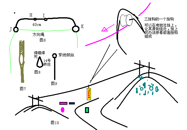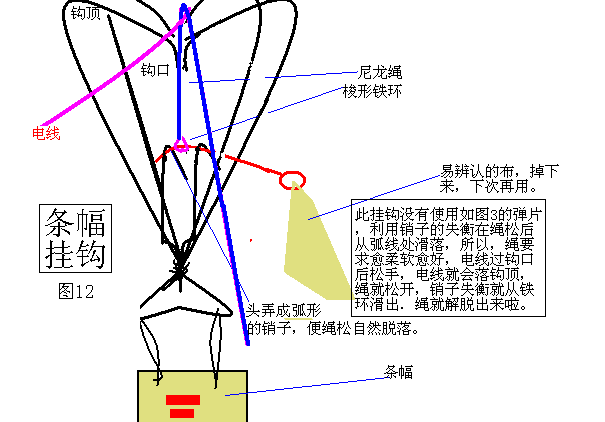 ⑴ 在家将喇叭用两根等长(约30cm)的尼龙绳拴好,绳头系铁丝小钩(以便挂在H、I孔内) ⑵将能承受喇叭重量的编织尼龙绳*的一头(Q端)穿过孔2——孔1——滑轮——孔2,拉出来使绳的中点(M)落在滑轮上,用透明胶带固定(防止绳子脱离滑轮槽),在离Q端约15cm的部位钻一个直径约5毫米的孔,用针线牵边如图7,使孔不至于被喇叭坠变形。如果尼龙绳不适合打孔,可在其末端接一个如图8所示内径约5mm的梭形环(14号铁丝)。把梭形环接口处刮干净,涂上松香用焊锡焊结实,防止接口断裂。梭形环太大,则不能穿过孔1顺利脱落。 *编织尼龙绳——最早是军用,挂吊床、拴帐篷,七、八十年代流行用作钥匙绳,绳头对接用火烧就可以粘结实那种。 ⑶将滑轮两边的绳分别绕成球,最末端绕在球外。(从绳的中点M向两端开始绕)以下的绳都这样绕。(喇叭绳) ⑷ 将一根细尼龙绳穿过J、K孔,两端绕成球。(方向绳) ⑸在一根较粗的尼龙绳的一端按步骤⑵做一个孔或接一个梭形环,另一端绕在铅笔上(线头留在外)。(挂钩绳) ⑹取一特细尼龙线(鱼线或补鞋线)约30m,将其一端固定在一个纸盒内,然后慢慢地使线自由落在纸盒内呈圈状,末端接一个重约2两的螺母,盒盖盖上,螺母固定在盒盖的外面。线事先涂蜡使其光滑,使弹弓送螺母向上走的过程中线自由的向上走而不至于乱作一团。此过程很关键。弹弓要有一定的强度和准确度。 ⑺找一个纸箱子,将方向绳及其连带部分放底部,盖一层布,再在布上放喇叭绳及其连代部分,再盖上一层布,上放挂钩绳及弹弓,三,四个销子及剪刀等。 ⑻现场:打开纸盒,一人托小纸盒,一人拉弹弓,将螺母对准高压线的边线和中线之间打过去,盒底的绳接在挂钩线的内抽头(没有梭形环的一头),拉螺母使挂钩绳向上走,将挂钩的末端小孔(或梭形环)置于图2的两钩之间,销子穿在两钩和小孔内,一人向上拉,一人握住喇叭绳掌握挂钩方向,使挂钩两钩挂在电线上,不能再向上走时,松开绳,销子即在弹力下脱出,绳脱落,收好绳。再将喇叭绳的小孔端照以上方法拉动外挂钩向上走,喇叭挂在H、I孔内。一个人拉着喇叭绳的另一头使喇叭向上走,一人两手拉着方向绳掌握喇叭的方向;挂钩穿过孔2后不能再向上走时,松开绳,销子弹出,绳脱落。取下方向绳,收拾现场,注意,不要丢物品。不要使绳潮湿。附1:做真相条幅直接取用四向内挂钩即可,销子改为弧形,(如条幅挂钩图)挂钩可以大大缩小,用穿线钢丝即可。为了不易取下,在一些高原地区的两山头之间往往有极高的高压线,若线下有公路,村庄,集市,可以在高压线的电桩处悬挂。此时的挂钩要改进,只用三向内挂钩,如图10,在每一个挂钩的顶部置一滑轮,从而将条幅滑向高压线的最低处,定时展开巨型条幅,定时只需3-4元。(前面已有介绍)。还可以在条幅中间裹上传单或小册子,这样展开同时可以使观众了解真相,但要考虑会否下雨或掉入水中。为了吸引群众,还可以定时放鞭炮,空中鞭炮响,引线末端系在固定条幅的小绳上,引线烧断小绳,条幅落下来,满天撒传单。在人多地方,效果较佳。 注意,在操作加工过程中要多实验,此处介绍方案操作简单,但制作较麻烦,可以适当改进。 制作条幅的方法: