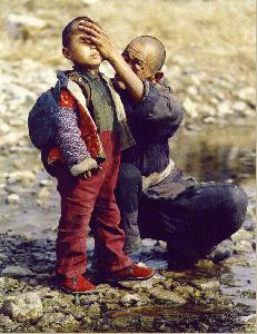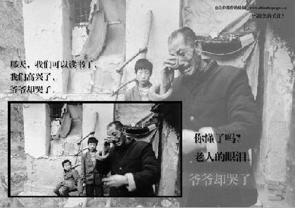 这就是生活在贫困山区的父子,他们一生别无所求。只求有一块属于自己的土地。也许一辈子他们都不知道外面的世界是什么样子。他们更没有想到的是,大法在今天洪传世间,什么样的福分在等待着他们;假如这些纯朴的百姓被江氏谎言毒害了啊,大法弟子们就没有尽到自己的责任啊。 第二张 哭泣的老人