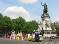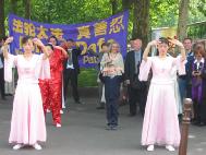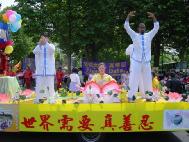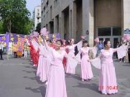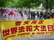 【明慧网2003年5月13日】为表达大法弟子对师尊慈悲苦度的感激,为庆祝大法洪传11周年暨第四个“世界法轮大法日”,为让更多众生了解大法、向他们讲清真相,法国大法弟子以在巴黎两个华人聚居街区游行的方式欢度节日。在很短的时间里,学员们齐心协力,分工赶制了横幅,购置了舞蹈所需的传统服装,经验不多的学员成功地将彩车布置得漂漂亮亮;部分学员通过认真的交流,在法理上更加清楚地认识到此次游行的意义及要向公众传达的信息,并共同撰写了介绍“世界法轮大法日”的中、法文传单。     5月11日中午约11点半,学员分别用中、法文向公众介绍了法轮大法在全世界的洪传盛况及“世界法轮大法日”的由来,然后游行队伍在歌曲“法轮大法好”的伴随下,由彩车引导,从“美丽城(Belleville)”出发,向共和国广场进发。彩车上有五位身着中国传统服装的不同肤色、不同年龄的学员展示法轮功五套功法,后面是表演莲花舞和扇子舞的学员,队伍最后是手举横幅彩旗的学员。还有一些学员在队伍两旁大量散发法轮功真相资料。一些台湾社团人士和热心支持法轮功的华人同胞也参加了游行。