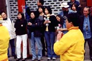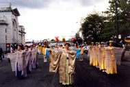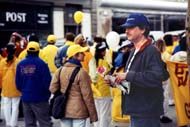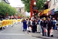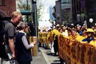 | 【明慧网2003年5月30日】地处温带海洋性气候的加拿大温哥华的五月,迟迟不去的沥沥细雨,给期盼温暖阳光的温哥华人带来丝丝寒意。据久居温哥华的朋友讲,温哥华什么都好,就是阳光略少了点,这五月天里,也就几天有太阳。 五月十八日,本也阴沉细雨的天空,却瞬间地放晴了。一千多名来自世界各地、年龄各异、背景不同的普通人——法轮大法修炼者,给这个世界上最美丽的城市,带来了无尽的温暖和清澈。温哥华人在享受这突然而至的五月阳光的妩媚时,更被这群普普通通人的特殊的善良、纯洁和平和的气氛所感染。