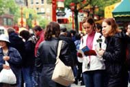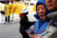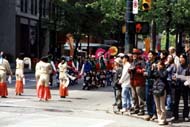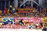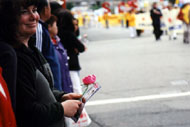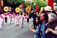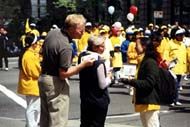 游行的队伍,走过了大街小巷,不期而遇的人们驻足观望。当人们的内心被真诚所感染时,善良从内心中被唤醒时,我们都能感受那份真情的存在。 “真 善 忍”的红色灯笼,表达了法轮大法修炼者内心的境界;手工做出的圣洁的莲花,代表着他们的真诚。雍容绚丽的唐朝服饰,展示着她们的美好风范。他们对世人没有任何索取,他们只希望大家都尊重这份圣洁,把握这份不期之缘。 “他们是谁?”“法轮功!”“法轮功?这就是法轮功!”“真漂亮呀!法轮功,真行呀!”“给我一张传单,行吗?”这样的相遇,可能就是佛家所非常看重的“缘份”吧。被打动的人们,非常礼貌地询问着自己内心的疑惑,关于法轮功的谎言太多了,普通人被欺骗的时间也太长了。喜欢思索的人们,或多或少地都会询问自己:“他们到底是为了什么?”“法轮功又为了什么?”…… ……,内心深处已被尘封良久的善念,醒了。  游行结束了,人们簇拥着“法轮大法好”、“真善忍”、“师父您好”和法轮旗一起留影,灿烂的阳光洒遍了美丽的温哥华,我身边的一位中国姑娘入神地望着,眼泪不停地往下掉,口中喃喃自语:“多好哇!…… ……多好哇!…… ……” 是呀,多好哇!如果,这世界上的每个人,都能将“真善忍”记在心间,都能从内心中关怀他人、要求自己,唤醒自己善良的本性,摈弃贪婪的私念。我们的世界可能就不只是阳光灿烂的世界,更是一个佛光普照的世界。