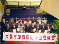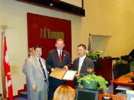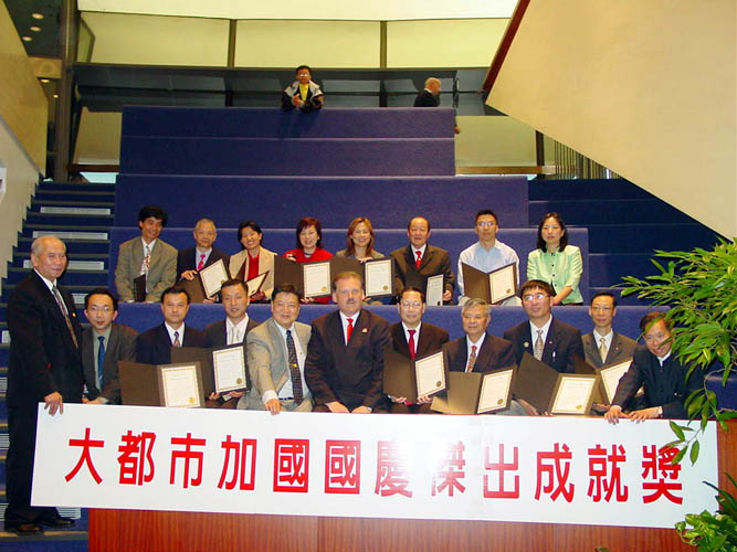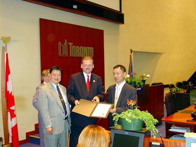 【明慧网二零零三年六月十四日】6月11日晚,2003年“大都市加拿大国庆杰出成就奖”在多伦多市政厅颁发。这项旨在表彰为加拿大社会及社区做出杰出贡献的义务工作者的成就奖始于20多年前,每年在加拿大国庆7月1日前夕在市议会大厅颁奖。今年有59名多伦多市市民获此荣誉,其中引人注目的是,法轮功学员张照进先生获得本年度的个人成就奖。  |   | | 张照进先生(右)与多伦多市国庆委员会主席考文-库任斯基先生和洪世忠先生合影 | 获奖的华人与共同主席考文-库任斯基先生(前排左5),洪世忠先生(前排左6)合影。 |