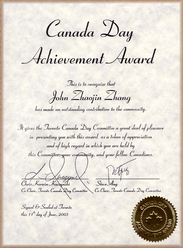 颁发仪式上宣读的给张照进先生颁奖的理由是:在过去5年中,他义务担任法轮大法学会的协调工作,参与组织了许多有益于社会的活动,这些活动吸引了数千名民众学炼法轮大法。此外,他还给无辜被拘留在其它国家的一名加拿大永久居民提供了帮助,由于他和他的同事们的这种帮助,这位与他素不相识的女士很快安全返抵加拿大。   张照进先生获颁的褒奖张照进先生来自大陆,任职于乔治布朗大学,平时热心于社区服务,对社会贡献良多,同时他也是一名法轮功义务联系人。据了解,法轮功学员因为贡献社区而获奖在加拿大并不少见,但因修炼法轮功并因为成功营救受迫害学员而获奖这在加拿大尚属于首次。 共同主席之一多伦多市议员考文-库任斯基(Chris Korwin Kuczynski)先生说:“获奖者不为金钱,无私奉献。他们中的许多人都是杰出的社会服务人士,这是我的责任去向他们道一声‘谢谢’,尤其是在国庆之际。拥有这样的公民,这样的人才资源,是加拿大成为一个伟大国家的原因,我为他们感到非常自豪。” 据多伦多市政府庆祝加拿大国庆委员会的共同主席之一、当地侨领洪世忠先生介绍,在过去的二十年里,这个委员会每年都要给对国家、社区做出杰出贡献的人士颁奖。候选人都有5年以上的义工经验、经社区推举、由委员会审查后选拔出来。今年得奖者中,除法轮功学员张照进先生外,华人有十多名,包括前香港中文大学新闻系主任,还有一名从大陆移居加拿大20多年、一直致力于把中医介绍给西方社会的中医师。 获奖人张照进先生认为,这不仅仅是对他个人的褒奖,而是对所有法轮功学员的褒奖。他说,“这表明了加拿大政府和人民对法轮大法及其所提倡的真善忍有非常全面的了解,同时也体现了加拿大政府和人民对法轮功的支持和尊敬。因为加拿大这个国家是非常注重义工的国家。志愿者和义工是非常受人尊敬的。法轮功学员对加拿大社会的贡献有目共睹。”
