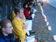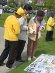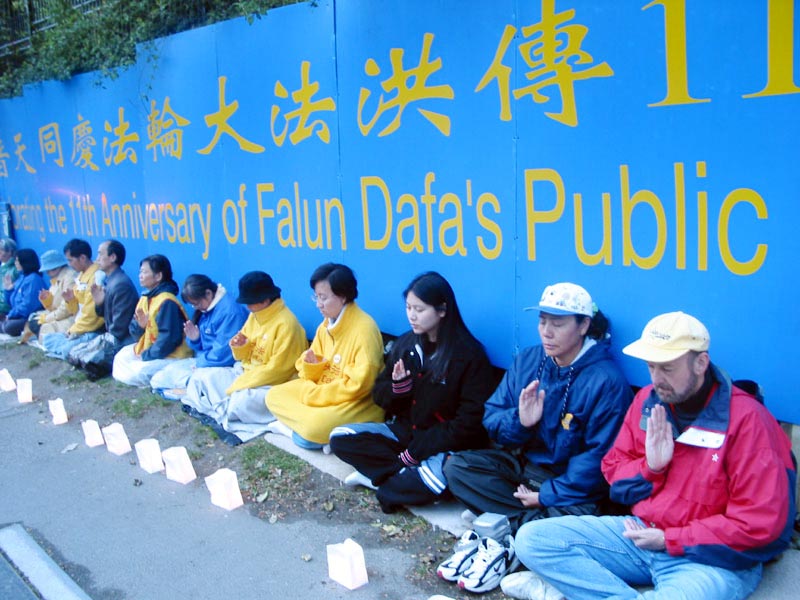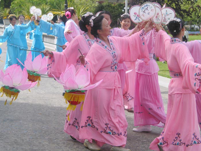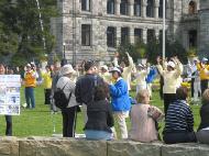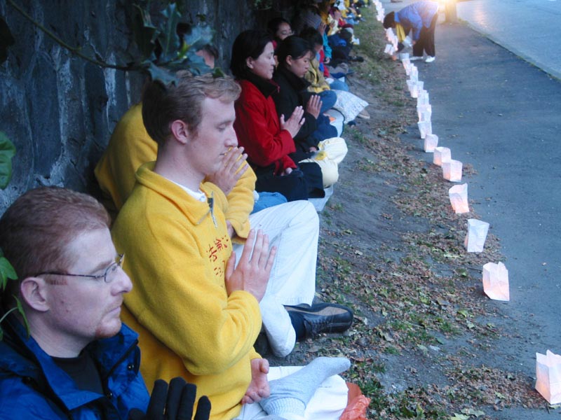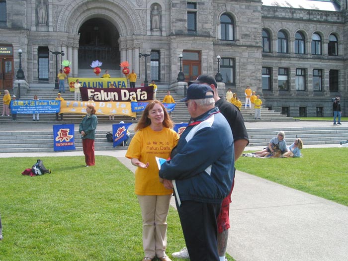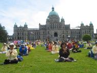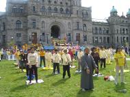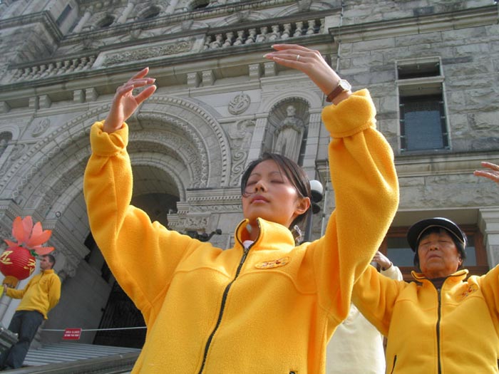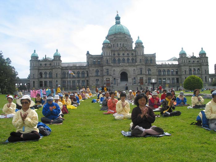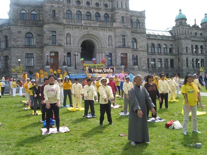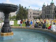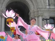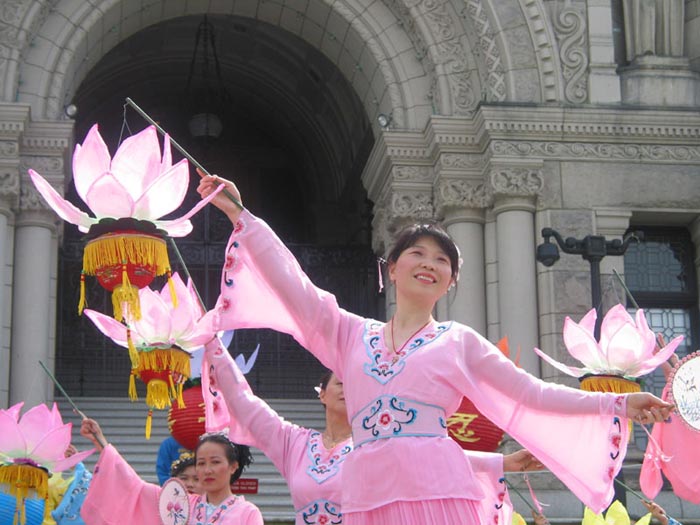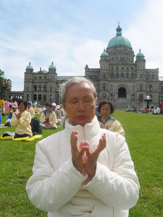 【明慧网2003年6月17日】今年五月有缘参加在加拿大温哥华举行的2003年加拿大法会,至今回忆起来,仍然久久难以忘怀。第一次来到享有盛誉的美丽城市──温哥华,又是在鲜花盛开的五月,时逢庆祝法轮大法洪传世界十一周年,师父又一次亲临会场为众弟子讲法。那种幸运与大法的殊盛,难以言表。在星期五傍晚,先来的弟子在使馆前发正念,在第一眼看到那整洁、肃穆、庄重、高贵的巨型蓝色展板时,那种震撼是巨大的,深感加拿大学员在使馆发正念方面的付出与整体提高的巨大,那是他们踏踏实实走过来的,让人肃然起敬。  发正念在星期天的法会之后,大部份学员离开了。星期一,即法会的第二天,是加拿大的节日维多利亚节。维多利亚市位于温哥华岛上,当日维多利亚市有盛大的游行,有一百多位学员参加了游行,并于游行后,在省议会大厦前面举行记者会及进行功法表演、舞蹈表演。在游人如织的维多利亚市,学员们平和的笑容、谐和的氛围及优美的舞姿吸引着人们的目光。身处其中,只有静静地拍照,捕捉那不断闪现的美丽、动人、祥和、平静,真切地感受着“大法之福”。时隔月余,依然好象在维多利亚市,在人潮中,在“美”的飞旋中。