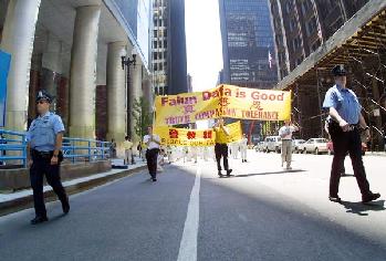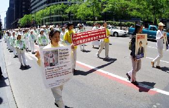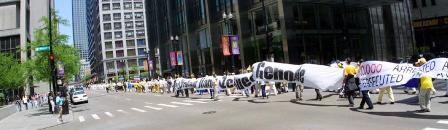 大型的法轮功游行队伍穿过芝加哥市中心前往芝加哥中领馆