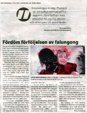【明慧网2003年6月30日】编者注:瑞典法轮功学员普瑞优投书哥德堡邮报,以自己的亲身经历,揭露中共迫害法轮功学员在海外的延伸。* * * * * * * * *我在泰国的抓捕是一个明显的中国政府迫害外国法轮功学员并对其他国家施压的例子。 我是一名法轮功学员。4月29日,在中国总理访问泰国的当天,我在曼谷被抓。泰国政府想将我驱逐出境并注销了我的签证。后来,我得知中国政府给泰国施加了压力。 由于我是无辜的,并且从未触犯任何法律,我进行了上诉并不得不在曼谷的拘留所中被关了五个星期。我感谢那些在这艰难的时期关心我和帮助我的人们。 我在泰国的被抓是一个明显的中国政府迫害外国法轮功学员并对其他国家施压的例子。我理解的是泰国害怕恶化与中国的关系。 这种迫害也曾在欧洲出现。在瑞典,中国使馆企图说服瑞典政府与组织不要支持我们。 在丹麦,法轮功学员用歌舞参加文化节的资格在中方压力下被取消。 面对这种压力,瑞典及欧盟能够坚定抵制是非常重要的,以便让我们的后代能够享有民主自由。 在拘留所里,我曾想起千千万万个在中国被关押并遭受酷刑折磨的法轮功学员。我也曾想起年初回中国探亲而被抓捕的美国公民李祥春(Charles Li)。 在中国,李被以一个莫须有的罪名判处三年徒刑。他曾以绝食来抗议。他遭受虐待以及灌食折磨。已有70多名法轮功学员在此种折磨中失去了生命。 如今,中国前主席江泽民与610办公室──一个类似盖世太保的组织,专门用来迫害法轮功学员而设置的一个国家机构,在美国、法国等地以反人类罪、酷刑和群体灭绝罪被告上法庭。 我希望全世界能够谴责这场在中国(对法轮功学员)的残酷迫害,让我们一起来结束这场迫害。