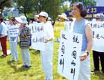 【明慧网2003年7月2日】世界日报7月1日华府报导,6月28日中午于国会山庄前举行一场「守住香港、守住良心」集会游行,全球反对23条立法联盟、全侨民主和平联盟(简称「全盟」)联手发起此次活动,集会中并通过一份支持者共同签名的一份决议文,与日前国会众院通过的第227号决议案,相互呼应。 反对香港23条立法集会的华人,不畏烈日,为捍卫香港民主、人权海外代言。「Article 23- No!No!No!」、「Democracy for Hong Kong-Yes!Yes!Yes!」,在「全盟」理事长巫和怡领头下,带动群众高呼口号,举着各式标语的示威者,情绪高昂。 香港立法局最后定稿的香港基本法第23条原文如下:「香港特别行政区应自行立法禁止任何叛国、分裂国家、煽动叛乱、颠覆中央人民政府及窃取国家机密的行为,禁止外国的政治性组织或团体在香港特别行政区进行政治活动,禁止香港特别行政区的政治性组织或团体与外国的政治性组织或团体建立联系。」香港立法局预定在7月9日对23条立法案进行表决。 这次华府反23条集会,在声援7月1日香港反23条大游行。集会中公开全球反对23条立法联盟决议文,文中严厉谴责中共和香港特区限制港民思想、言论、信仰、及集会自由;强烈要求中共和香港特区取消23条立法,呼吁全球关心香港未来的人们加入反对23条立法的行列。 全球反对23条立法联盟由全侨民主和平联盟、美京中华会馆、全美学自联、大费城亚洲文化中心、益群书店、创舜公司、民主中国阵线(民阵)、六四调查委员会、明慧学校等十余团体共同组成。当天与会者超过百人,声援的组织还有民主基金会、国际特赦组织、法轮功之友会、自由之家(Freedom House)。 一位法轮功学员认为,香港特区政府在北京示意下推动的反颠覆23条基本法立法,乃是针对法轮功而来,当天有不少各地法轮功学员赶到华府响应这次集会。