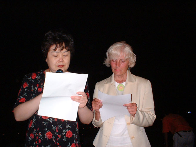 大法弟子在烛光守夜开幕式上致词 | 【明慧网二零零三年七月二十六日】在五十五年前,联合国通过了一份纲领性的文件──《世界人权宣言》,规定人人皆享有信仰的自由和言论的自由。这些天赋人权跨越国界和政府而得到人类的公认,对这些权利的践踏是对人类道德和尊严的公然挑战,任何一个知道真相的个人和政府都在做着自己的选择。如同水火不同道,正邪斗争中没有第三种选择。我们知道,因坚持对“真、善、忍”的信仰而被毒打致死的同修已经有738人了。因为信息封锁,也许这个数字只是实际殉难人数的小小一部分,然而仅仅从这冰山的一角,我们足以看到镇压者的凶残、暴虐、血腥、非理性和非人性。每一个被迫害致死的同修背后都有一个令人发指的迫害故事,也会有他们的亲朋好友在得知噩耗后那种椎心泣血的痛苦。镇压者可以打死一个七十多岁的老人,打死一个不到一岁的婴儿,可以把健康的人送进精神病院,可以把妇女剥光衣服投入男牢房。江泽民,这个邪恶的镇压者和追随它的爪牙们没有任何道德上的顾及,没有任何羞耻感,更不懂得信仰的力量、生命的价值和对神的敬畏。 四年来,多少大法中的伟大生命,在实践真、善、忍的历程中,面对刽子手挥舞的屠刀,大善大忍、无怨无悔、前赴后继地沿着坚持正信之路,为人类历史开创了史无前例的悲壮篇章。 今天,2003年7月21日,当喧嚣伴着落日散尽的时刻,天与地都融归于苍穹,世界各地的千余大法弟子代表汇聚在自由之邦的首都,燃起成片的烛光,静静地继续证实大法、揭露邪恶、讲清真相。 通过修炼我们都知道,人世间的生死不是生命真正的生死,生命因为同化大法而获得永恒。当铺天盖地的邪恶盖顶而来时,在坚持信仰就可能失去世间一切的压力面前,我们选择了真理,选择了正信,选择了无畏。 738位真心向善的同修,在法正人间之前离开尘世并不是他们的选择,他们原本可以和我们一样,见证整个正法过程的始终,最大限度地实现在人间实践真善忍、救度众生的善诺洪愿。 这些同修也许和你我一样普通,有着或者没有很高的学历、丰厚的资产和显要的地位,但我们为大法而成的心灵同样地高贵。不久的将来世人会猛然发现,先行者们维护正义和真理的坚实脚印为人类树立了一座座光照千古的道德丰碑,大法弟子的勇气和故事会流传不止,与历史上最伟大的舍生取义的英雄传奇一起相映生辉。 四年的光阴弹指一挥间,邪恶在正义的声讨声中走向了末路,谎言在坚韧不拔的讲清真相中惨淡退场,无数善良的人们在事实真相面前得到救度。更有万万千千得法修炼不久的生命,在坚定正信中走向成熟,往日的痛苦和泪水,今天都化作了正法弟子的威德与正悟。 今夜的烛光不是悲伤而是召唤,伟大的生命们今天与我们再聚人间,共同召唤苍宇众生:坦然地面对真相吧,勇敢地迎接真、善、忍吧!那是世人平安走向未来的桥梁;遵从真、善、忍吧!那是宇宙众生的光明通途,能使生命获得幸福与永恒! 有道是: