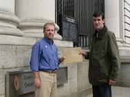 【明慧网2003年8月11日】 在爱尔兰总理府前。 | 7月29日一名英国大法弟子带着英国学员写给爱尔兰政府各界的营救亲人的信和详细案例来到爱尔兰。英国法轮功学员在全国范围内讲真相、营救亲人,给议员及媒体递信的活动已经接近尾声。但作为英国管辖范围之内的北爱尔兰,却因为地处爱尔兰岛内,与英国隔海相望但却不归爱尔兰管辖,就成了一个英国学员很难想起来、爱尔兰学员也兼顾不着的空白地带。这几年来,只有几次爱尔兰学员和英国学员去北爱尔兰的首都贝尔法斯特洪过法。这次,英国学员与爱尔兰学员作了交流,爱尔兰学员也很重视这次和英国学员联合讲真相营救亲人的活动,两个爱尔兰学员在这名英国学员到达后便分头和他一起在三天时间内拜访了爱尔兰最大的三个城市:首都都柏林(Dublin)、海滨城市高威(Galway)和利默里克(Limerick)和北爱尔兰最重要的三个城市:首都贝尔法斯特(Belfast)、里兹本(Lisburn)、新城(Newtown)。在那里法轮功学员向当地的议会和媒体递交了我们的呼吁信和详实案例。 这次英国、爱尔兰学员联手营救的亲人包括英国学员谢卫国的未婚妻朱永洁;英国学员朱宝生的妹妹朱宝莲,被中国大陆非法关押的英国学员郑旭军、爱尔兰学员杨方及刘锋、张晓娜夫妇。