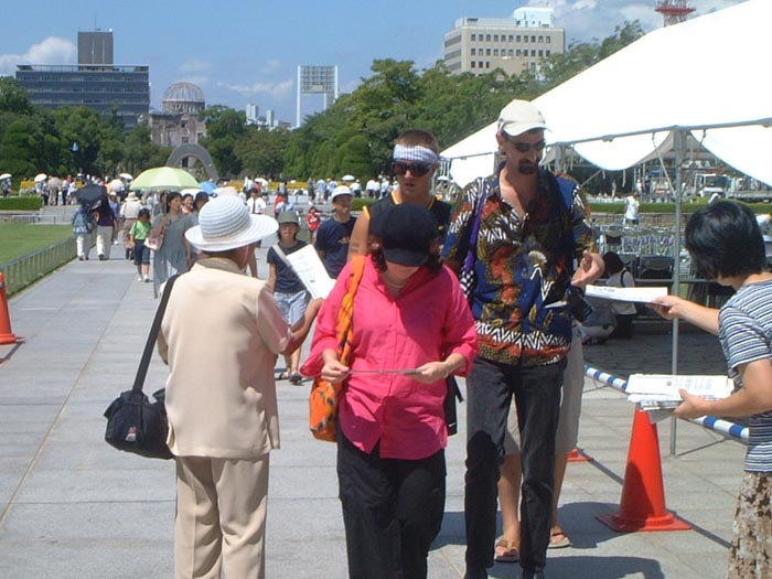 广岛的法轮功学员利用这一天进行了讲真相活动。白天他们顶着烈日派发了六千份报纸之后,晚上在和平公园的一角举行了烛光悼念活动。在一队队高喊「反对核武器,反战」口号团体中,他们自始至终静静地用一种特有的方式表达着对和平的向往。晚上,在「普度」音乐伴随下,法轮功学员手捧着蜡烛,悼念着被迫害致死的756名同修。善良的广岛人,纷纷走过来,有的拍照,有的双手合十以表哀思。其中有一位日本中年妇女静静地走到学员身后、双手合十、然后与一位学员说起了她的心声。“50年前、日本军国主义给中国人民带来了巨大的灾难、同时也给中日两国人民的友谊带来了不幸、希望今后不要再有同样的事发生。”这位妇女对中国政府镇压法轮功感到非常的遗憾、希望早日结束这场迫害。场面庄严肃穆,催人泪下。