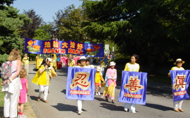 【明慧网2003年8月3日】世界日报温哥华7月31日讯/为期两天的第十六届加勒比节(Caribbean Days),日前在北温以多元文化游行拉开了序幕,展示巴西、中东、圭亚那、墨西哥以及中国等不同文化的21个团体参加了游行。加勒比节的主要目的在于促进多元文化交流,并以此推进当地旅游业的发展。温哥华法轮功社团应邀参加,也是参加游行的唯一华人团队。