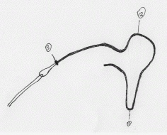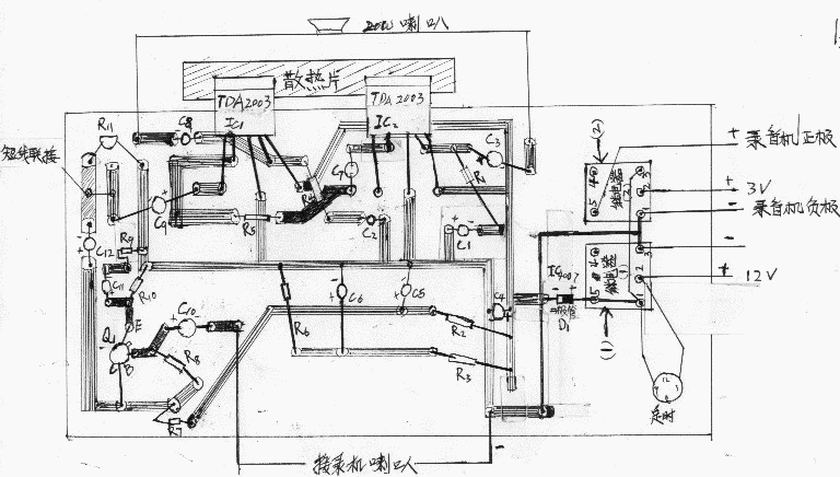 非常简单可用的悬挂小喇叭的工具:如图一:粗线条为铁丝(可根据悬挂重量选择,一般我们用人力车条),细线为绳,将小喇叭固定在(1)上,将绳如图双固定在(3)上,另用绳穿入固定绳中,将绳一头扔到高压线上,把小喇叭拉上高压线,最终,(2)点一定挂在高压线上。然后,将纤绳单股拉下。定时放大器的制作:定时放大器的印刷电路板如图(三),元件装配图如图(四)。放大器为双电源供电,其中录音机电压3伏,放大器电压12伏。定时器用小电子闹钟代替,定时可在12小时使用。 工作原理:用小闹钟的报时触点,接通控制继电器(1)的线圈电源,使继电器工作。把继电器一端接在闹钟的负极导线上,另一端接继电器的导线。 具体做法:将小闹钟机芯取下,用小刀把后盖打开,里面的小轮不动,利用两个报时的金属片。其中一片与闹钟的电池负极相连,焊出一条导线来,另一条与线路集成块黑点相连,把连接处用小刀切断(不切表有尖叫声,电压也不稳),在金属片处焊出一根线,在机芯适当处开一个小口,把电池接上闹钟,应正常走动,在把这两根导线接入元件装配位置图(四)的12伏启动继电器(1)的2、3接口上,作为定时启动开关。随身听录音机使用3伏独立电源,由继电器(2)控制。继电器(2)的接线柱2接3伏电源的正极,5号接线柱接录音机正极线,负极接1号接线柱上,3号接线柱与继电器(1)的1号接线柱相连,受定时器控制。 信号输入:打开录音机后盖,在喇叭线处焊出两根导线,一根接图(四)电容的C10的负极上,另一根接电池负极处(零线),作信号输出。(有的录音机直接一根线与电容C10幅短,另一根不用接。) 说明:1、此方法是在同修的方法上进行改造的,我也是门外汉,如有不通的地方,请来信共同探讨。2、用“星球”牌汽车送话器电路板改造小喇叭:将两个继电器接在电路板上即可(起控制放大器和录音机)。方法:继电器上有5个触点,分别是:常开、常闭、两个线圈和中间接线柱。将第一继电器控制放大电路的12伏电源。把火线接在中间接线柱上,把常开和线圈触点相连,引出一根线作为定时器的两接线,另一线圈触点接电源的负极。第二继电器控制3伏录音机电路。把第一线圈的线圈触点第二继电器的线圈触点相连(通过12伏电压控制继电器的通断),中间触点接3伏电源的正极,常开触点接录音机电源的正极。另一线圈接线柱与第一继电器的线圈接线柱相连后接12伏电源的负极上。第一继电器中间接线柱引线通过闹钟与第一继电器线圈结线柱引出的线相连,起定时作用。