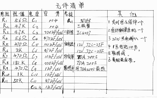 |  | | 悬挂小喇叭的工具(图一) | 元件清单(图二) |  |  | | 印刷电路板(图三) | 元件装配图(图四) |