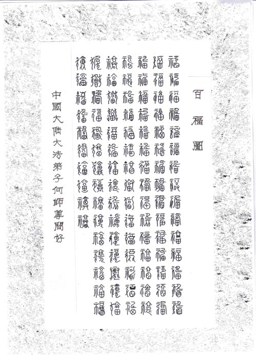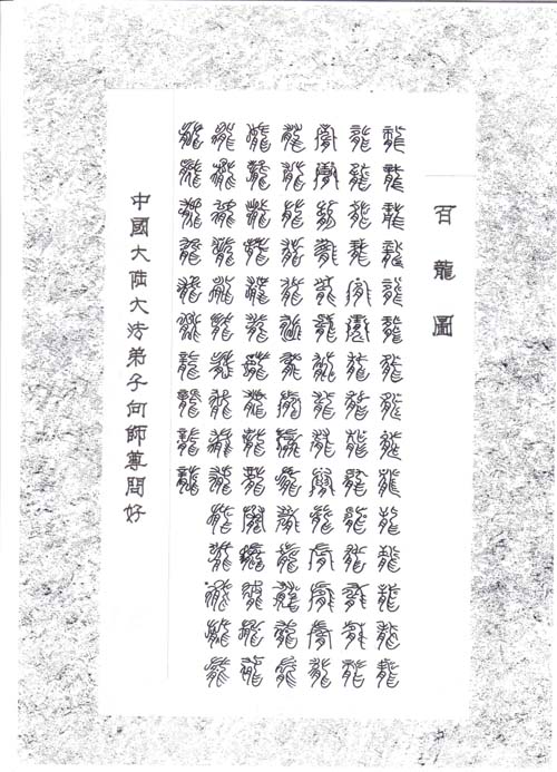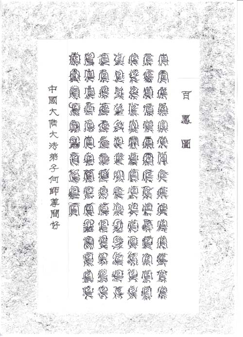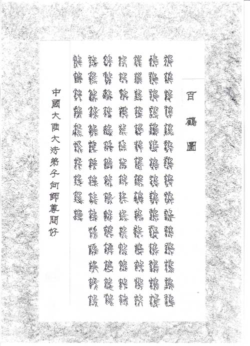 【明慧网2004年1月20日】这是大陆大法弟子献给师尊、祝师尊新年好的一幅作品。各一百个篆体龙、凤、鹤、福字,喻“龙凤贺福”之意。