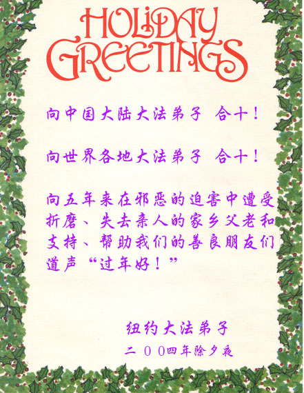 Tong Xiu Hao, Xin Nian Hao! Fellow Practitioners Happy New Year! The First True Brand New YearDaily chores, jobs and family, Living our lives with rationality. Beyond anger sorrow and delight, Our still hearts shinning bright. Pounding on our hearts, evil everyday, Cultivate sincerely, finding the true new way Tireless saving sentient beings, Masters smile, over seeing Striving forward wasting no time For those lost and the blind. Magnificent future beyond compare Persist on breaking through! Into the first true Brand New Year! Happy New Year fellow disciples in China! Happy New fellow practitioners around the world! | 恭祝同修新年好, 万象更新春来到。 工作家庭与生活, 正常理性来指导。 喜怒哀乐心不动, 慈悲祥和佛光耀。 魔难面前向内找, 邪恶烂鬼无处逃。 时时处处“真善忍”, 真修心性走正道。 不辞辛苦救众生, 师尊看护神佛笑。 迷途羔羊醒来早, 抓紧救度争分秒。 前程光明倍辉煌, 勇猛精进迎春到。 遥贺大陆众同修, 全球同修新年好。 |