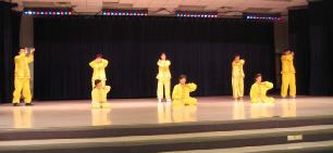 孔雀舞是中国少数民族傣族民间舞蹈,深受人们的喜爱。孔雀象征着好运、幸福、美丽和诚实。一位法轮功女学员表演了独舞--孔雀舞。随着优美的音乐,她翩翩起舞,婀娜多姿,把一只美丽的金孔雀再现在观众面前,不仅独具异国风情,更让人们体会到美好,让人感到美好舞蹈艺术真是无国界的。学员们表演的第二个节目,是由9名学员组成,身着金黄色炼功服的法轮功功法表演队,8名学员为来宾们演示祥和、优美的五套功法,一名上高中的小弟子在舞台的讲台上为功法的动作做解释。功法表演队包括了所有年龄段的人,小学生,中学生、高中生、青年、中年至老年-- 一位七旬的老年弟子。观众们知道了每个人都可以炼法轮功,当学员们随着庄严、祥和的炼功音乐,展示着优美、舒缓的功法的时候。台下,有的学生、家长、老师也情不自禁地跟着学起来。 最后一个节目,是由几位女学员编排的舞蹈。学员们身着高雅、华丽的唐装,在音乐声中如仙女般飘然而至台前,令观众耳目一新。在悠扬舒缓又起伏跌宕的音乐中,她们时而如漫天彩云飞绕于天上,时而又如威武的壮士,于世间助师正法,浩气凛然。在音乐结束的高潮中,学员们打出了“法轮大法好”的英文横幅,赢得了观众阵阵掌声,使得整个活动达到了高潮。 表演结束后,学校给学员们颁发了褒奖,感谢对他们活动的贡献及带来了这么好的中国的传统文化。在结束后,一个华裔中学生碰到身着炼功服的学员时用中文说:“法轮大法好”! |