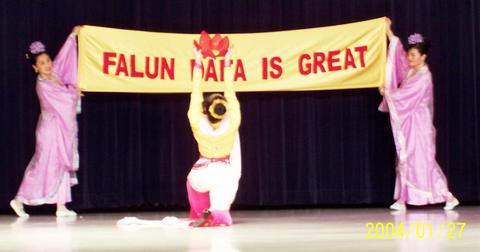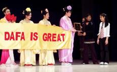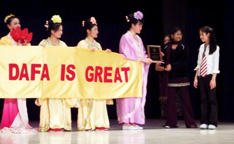 【明慧网2004年1月30日】美国德克萨斯州的布兰诺市是一个移民人口比例很高的城市,近些年此市的华人人口的比例更是激增。为让学生及家长们能在这个多元的文化背景中更好的彼此了解,该市的Haggard中学,于1月27日晚举办了国际艺术节活动,邀请来自各个移民国家的团体来到学校演出,展示他们自己国家的传统文化。达拉斯地区的法轮功学员应邀参加了此次活动,并给大家带来了三个具有中国传统文化特色的节目。