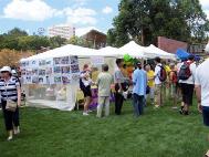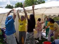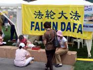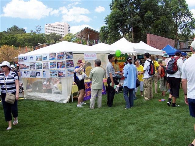 | 【明慧网2004年10月23日】澳洲昆士兰东南部的法轮功学员参加了政府在布里斯本美丽的罗马街公园举办的昆士兰多元文化节。这是目前为止总理办公厅举办的最大的多元文化节,有3万人参加。人们看到感受到学员及炼功场面所带的祥和能量和大法的美好,许多人对法轮功表示出兴趣并当场学功。组织者还在我们帐篷后的湖中放漂了几个粉色的大莲花灯。 由于天气晴朗炎热,我们搭了2个帐篷--一个用来表演和教功,另一个用来发传单和教人们如何折纸莲花。我们还把迫害前在中国集体炼功的照片和大法在全世界,包括我们在昆士兰参加的许多五彩缤纷的游行和表演的照片挂起来,以展示大法的美好。 活动有一个规定就是我们不可以展示和分发任何有关迫害的资料,因为这一天主要是为娱乐表演而设计的。然而我们仍旧可以和人们谈中国的形势而且这是一种讲清真象的最好方式。在人们看到感受到学员及功法所带的祥和能量和大法的美好后,他们对大法在中国所遭受的迫害非常震惊。各国人民对大法的广泛支持清楚的证明了“真善忍”是普遍真理。 我们得到了一个最好的位置,是参加文化节的人的必经之路。我们一整天都被淹没在人群中。学员们事先做了很多要在活动上发的莲花,我们还买了大量的彩纸用来给学做莲花的人。感兴趣的人如此之多,我们传单发完了不得不去加印,而且那天活动结束前我们做莲花的彩纸也用光了。许多人当场就学了功,包括一些孩子。来自非洲国家的成人和孩子似乎特别被大法所吸引,有些人久久不愿离去,跟我们待了几个小时。 昆士兰东北的多元文化社区对大法的反应如此强烈,显示出各种族和信仰的人民都在觉醒,想要得闻大法。 布里斯本最大的报纸《信使报》(Courier Mail)以“文化节满足各种口味”为标题的文章在头一行写到:法轮大法帐篷上的标语“真善忍”总结了昨天开幕的昆士兰多元文化节的精神。