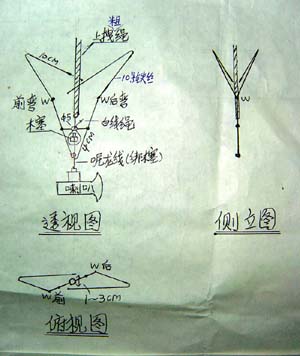 《看图做定时喇叭》中的锚挂喇叭㈠。木塞法1.木塞法①的(4)“将上拽绳抖缓抽下。(有时夹住可用力拽住白线绳)”应改为:有时夹住可用力拽“断”白线绳。 锚挂木塞法(补充) 三视图: 1. 锚臂前。后弯,绳为轴垂在正中心,四个方向接受电缆 2. 挂钩间距1至3厘米(视电线粗细)钩间与木塞孔距应大于2倍的电缆径。(钩间距应窄与电线径,带弹性撑拽进去) 3. 把木塞围托进ø5孔卡住后拽上电线挂住后突然松绳。木塞等自重离孔,如不离孔可用力拽断线绳则粗绳下来。