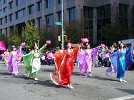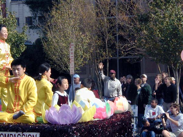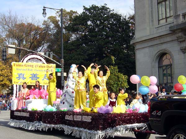 洛丽市是北卡州的首府,这个地区的人们较为保守。在过去的几年中,学员曾经申请过几次游行,都未被批准。今年学员在申请的过程中作了比较充分的准备,除了对法轮功的介绍外,还列出本州学员曾参加过其它城市的节日游行,并附上其它州学员参加盛大游行的花车、舞蹈照片,告诉主办者我们也将有美丽的唐装舞,主办者欣然同意。 游行当天,气候温和,据估计沿街观众约有6万人。洛丽电视台对圣诞节大游行作了现场直播,估计另有20万电视观众观看了游行。法轮功学员的队伍受到观众的青睐,别致的莲花舞,美丽的花车,花车上的功法表演及身着古装学员的招手问候赢来观众阵阵掌声。