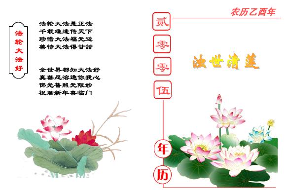 【明慧网2004年11月6日】(4合1)A4纸16页 下载“浊世清莲:2005年日历”(1.1MB) 打印指南:(一次两份快速装订打印法) PDF 文件: 第一步:先打印单页,在“文件--->打印”设置页面范围,设置单页,再按“确定”按钮即打印; 第二步:将纸翻面; 第三步:再打印双页,在“文件--->打印”设置页面范围,设置双页,再按“确定”按钮即打印。 第四步:从长边中间裁切开,沿中线装订,即为两份小册子。 WORD 文件: 第一步:在“文件--->打印”里设置页面范围,输入下列页数: 16,1,16,1,14,3,14,3,12,5,12,5,10,7,10,7 设置缩放选项为每页4版,按纸型缩放为A4纸。再按“确定”按钮即打印; 第二步:将纸翻面; 第三步:在“文件--->打印”里设置页面范围,输入下列页数: 2,15,2,15,4,13,4,13,6,11,6,11,8,9,8,9 设置缩放选项为每页4版,按纸型缩放为A4纸。再按“确定”按钮即打印, 第四步:从长边中间裁切开,沿中线装订,即为两份小册子。