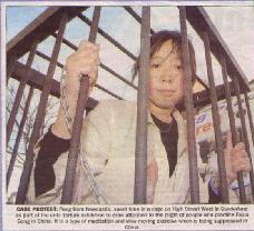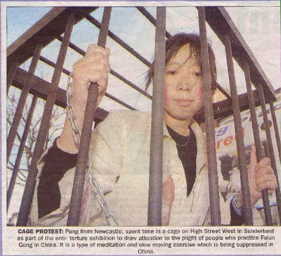 | 【明慧网2004年12月1日】2004年11月,法轮功学员在英国桑德兰市举行了反酷刑展。71岁的黛安娜表示,我们可以在这里自由的修炼,然而我们有责任让公众了解在中国发生的对法轮功的迫害。法轮功学员在桑德兰市西高街演示关在笼子里的酷刑 英国桑德兰市《回声报》11月17日报道,法轮功学员在桑德兰市街头举行了酷刑展,告诉人们他们在中国遭受的迫害。在中国,这种与太极相似的修炼虽然受到大众的喜爱,却被严厉禁止。 在英国,法轮功在桑德兰市也受到人们的喜爱。现年71岁的黛安娜(Diana Whipple)曾是一名爱斯布鲁克(Ashbrooke)的教师,现在是一名法轮功爱好者。黛安娜说,“自1999年开始修炼法轮功以来,我的身心有了很大改善。” 她说,“我们可以在这里自由的修炼,然而我们有责任让公众了解在中国发生的对法轮功的迫害。” 在酷刑展上,还有一份反对酷刑的请愿书。这份请愿书将呈送联合国人权委员会和欧洲议会。