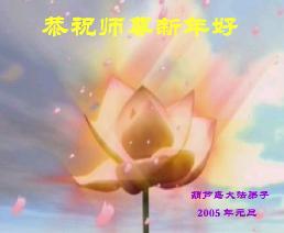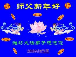 敬爱的师父:您好!值此新年到来之际,潍坊大法弟子向敬爱的师父祝贺新年好!我们想念师父! 在风风雨雨中,我们又走过了一年,跟随师父助师正法、证实法、救度众生是我们大法弟子无悔的选择、最崇高的使命。请师父放心,我们会更加努力做好大法弟子应该做好的三件事,不愧对师父的慈悲苦度,不辜负众生的久远期盼,不辱没我们的史前大愿。 在此,我们也与全世界大法弟子一道共贺新年好!愿我们共同精進! 赋诗一首敬献师父。 无悔的选择 连宵风雨六冬雪 无悔选择心如铁 大法铸就金刚志 随师正法世间行 历经万难终大成 师尊佛恩化天地 新宇众生喜开颜 净莲感师苦度恩  潍坊大法弟子 2005年元旦 河南省新乡市全体大法弟子祝师尊新年好!
