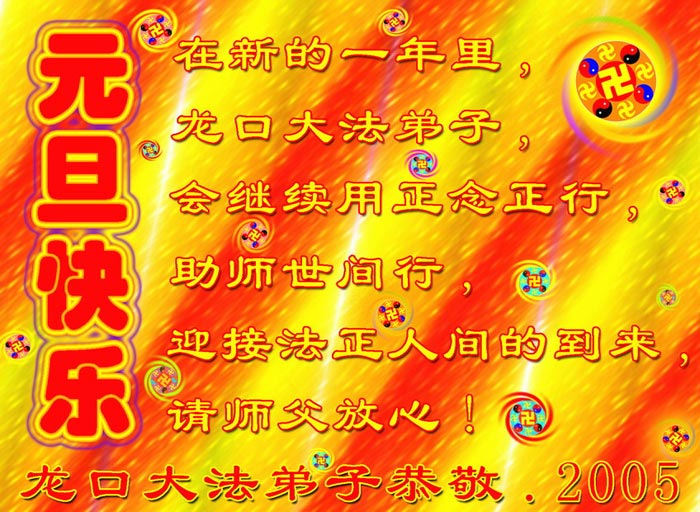 艰辛之中又走过了一年,在讲清真象、救度众生的進程中,几多付出,几多收获。归期近了,时间紧了,我们的心态更加稳了,还有什么放不下的执著牵挂吗。了却人心恶自消,众生得救洪愿了!在剩下的时日里,黑龙江省佳木斯市全体大法弟子、新老学员会尽心尽力做好师尊要求的三件事,不负师恩,不负众生所盼!借此新年到来之际,恭祝师尊新年快乐!顺祝海内外大法弟子新年好! 助师尊 度众生 大法徒 担重任 灭恶狂 驱阴云 救世人 喜迎春 感师恩 谢师尊 新宇神 舞天韵 佛恩浩 满乾坤 天地固 法长存 黑龙江省佳木斯市全体大法弟子、新老学员敬上 2004年12月28日 黑龙江省佳木斯市大法小弟子给师父拜年