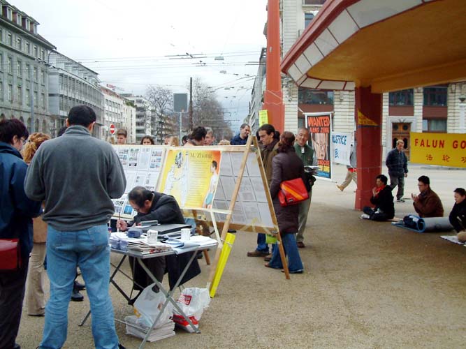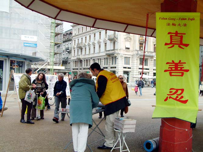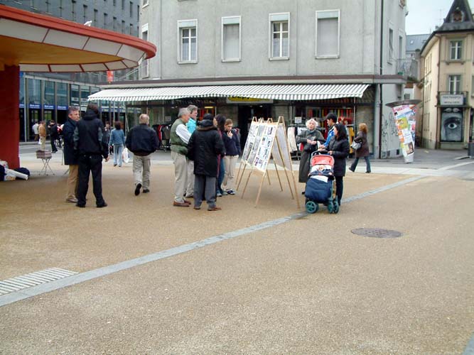 【明慧网2004年3月25日】2004年3月20日,瑞士法轮大法弟子在毕尔市(Biel)举办了洪法讲真象活动。毕尔是法语、德语两种语言混合使用的地方,为了方便向人们介绍法轮功及在中国发生的迫害等相关情况,大法弟子们分别从法语区、德语区来到活动地点,展开讲真象活动。