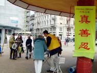真象展板周围,站满了观众。有的人看完展板后,主动索取真象材料,并签下了自己的名字,表示对法轮功的同情和支持。对中国文化有兴趣的行人,到书法摊位排队等候他们喜爱的,由大法弟子书写的“生命需要真善忍”、“法轮大法好”等汉字条幅。 大法弟子们与人们交谈,向大家介绍法轮功以及在中国发生的对法轮功学员的残酷迫害。一位来自中国的年青人,听了大法弟子讲述法轮功被迫害的真象后,说,江××这个人是很残暴的。 大法弟子们还坚持发正念及演示五套功法,整个场面充满慈悲、祥和的气氛。 当地的报纸、广播电台前来采访,并及时正面地报道了法轮功当天的洪法情况。