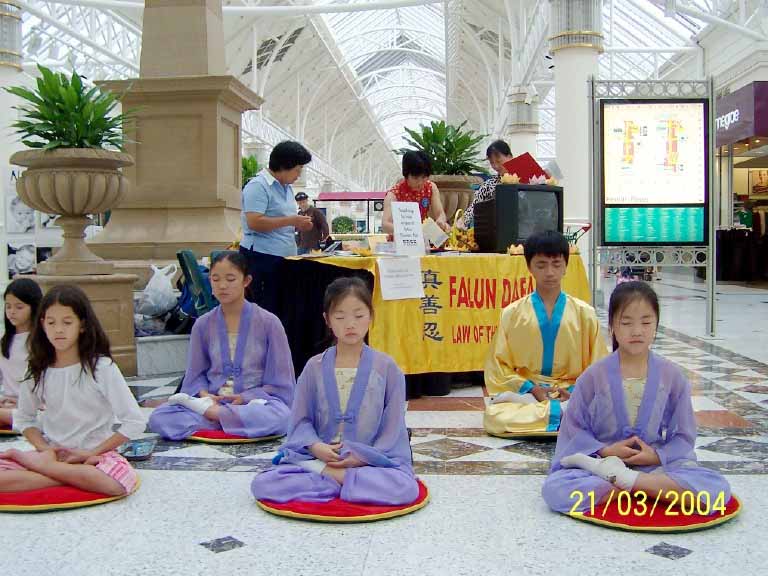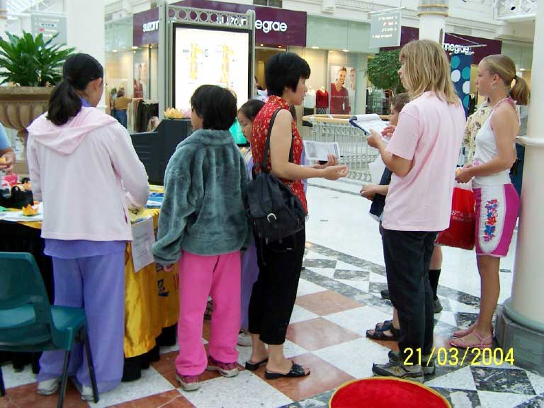 【明慧网2004年3月25日】3月21日星期日,法轮功学员们来到西悉尼最大的购物中心之一的番瑞斯购物中心参加洪法和征签活动。这是自日内瓦人权会议召开以来在番瑞斯区举行的第二次洪法活动,洪法摊位是购物中心经理在得知法轮功学员在中国所遭受的残酷迫害后免费向学员们提供的。