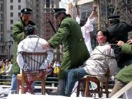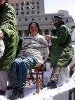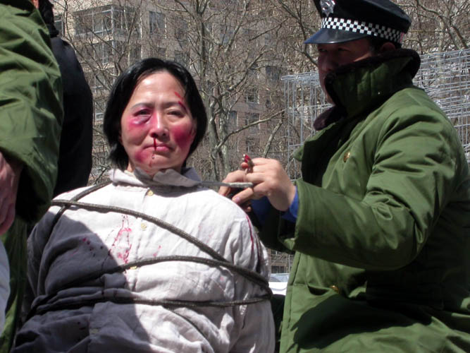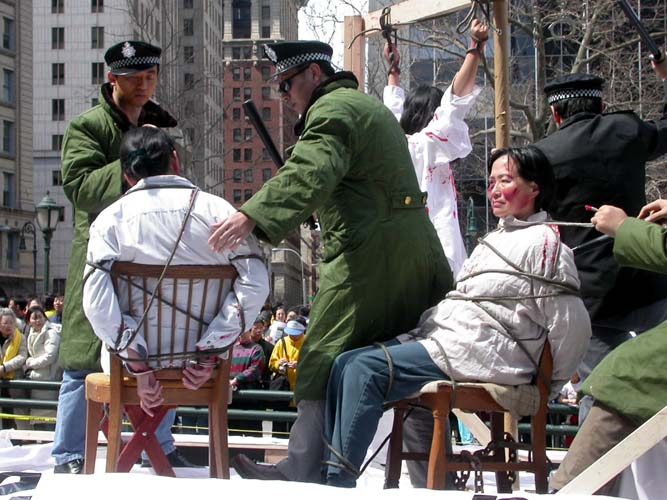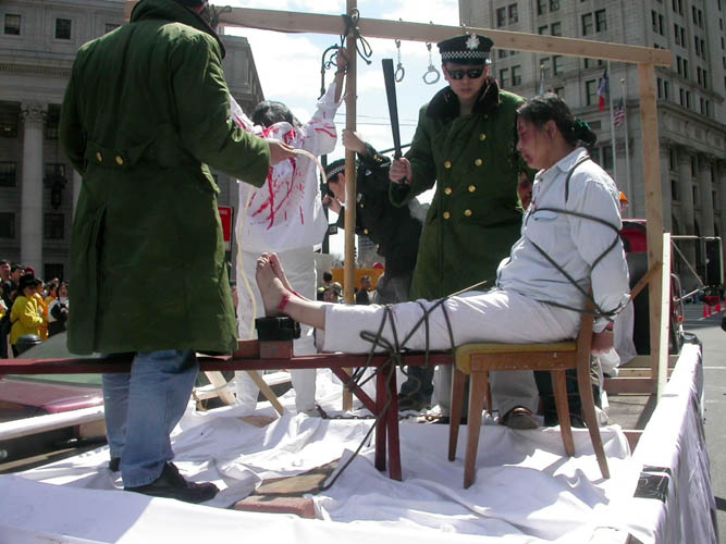 上图:这位在纽约大游行中亲身演示迫害的大法弟子陈女士来自中国大陆,是音乐家,在中国著名的中央交响乐团工作了33年,直到退休。99年迫害全面公开后,曾因为法轮功说真话而依法上访并遭到关押。她的儿子陈刚原来是加士伯酿酒业北京分公司后勤经理。陈女士说:“2000年6月25日深夜,十几名警察闯进我家,没有说明任何理由,把熟睡中的儿子和我抓走。拘留30天后我被释放,但是儿子却被送到位于北京郊区臭名昭著的团河劳教所,他在那里度过了他一生中最黑暗的18个月。 “为了强迫我的儿子放弃他的信仰,劳教所的警察对他进行了惨无人道的酷刑迫害,每天只有2-4小时睡眠,有一次他们连续15天不许他睡觉,只要他一合眼,就会遭到拳打脚踢。 “警察还用几根高压电棍同时电击他身体的敏感部分,例如头、颈、胸部等等,被电击处皮肉烧焦,全身猛烈颤抖,整个身体仿佛被放在火中烤,仿佛被毒蛇叮咬。有一次,警察指使同室十多名犯人毒打他,使他的脸都变了形,然后把他的脚和腿紧紧地捆绑起来,把两只胳膊捆到背后,再把他的脖子和腿紧紧地捆在一起,使他几乎窒息,然后把他塞到床底下,在床板上坐上人,使劲往下压他的背,当时他感觉他的骨头都要断裂,这以后他有两个星期不能行走。另一位名叫鲁长军的学员在这种同样的酷刑后瘫痪了。 “我的儿子遭受这一切,只是因为他修炼法轮功──这个带给他健康身体和幸福生活并教他做好人的功法,只是因为他要坚持自己对真、善、忍的信仰。”   上图:所谓“关小号”的一种,在这种长时间的侮辱性惩罚中,为防止法轮功学员打坐炼功,警察使用固定在牢笼两侧的手铐让人双手无法相互接触。牢笼的尺寸故意做得让人躯体无法伸直。这种刑法的目地也是为了通过对人身体的高强度折磨让人放弃高贵的精神和对“真善忍”的信仰。    上左:清华大学毕业生赵明在爱尔兰读研究生期间,因回中国大陆为法轮功上访而遭到劳教和酷刑折磨。上右:红色展板中显示的,是法轮功学员受到的近百种酷刑中最简单、易描述的几种。常见的酷刑包括:多根高压电棍同时长时间电击(其中包括放在大法弟子嘴里放电,电击胸部、腋下、乳房、阴部等等);在暴打的同时用塑料袋套住被打者的头以图后者在窒息的恐怖中屈服、“五马分尸式”毒打(就是把人的四肢向四个不同方向拉开,越拉越紧进行毒打,整个人痛得象被撕开一样)、两脚倒挂悬空毒打、鞋底打脸、木棍铁棍暴打;抽人的鞭子有皮的、铜丝拧成的、钢筋条、荆条、全竹竿(带刺)、橡胶棍、狼牙棒;形形色色的手铐、脚镣、背铐、扎镣子(手脚铐在一起、不能行走、吃饭、上厕所都不能)、“烟杆铐”、“狼牙铐”;地牢、水牢、大粪池、死人床、坐板、蹲小号、坐铁椅子、坐老虎凳、超长时间军蹲;上绳、铁钉钉指甲缝、铁钳子拧肉、用钳子拔指甲、用针扎十指、鼻子点浓酸;对绝食抗议者进行惩罚性灌食、故意将灌食用的胶管从鼻腔插入进行折磨、用普通塑料管灌辣椒水、灌掺入少量水的大盐、灌刺激性药物、灌大粪汤、一日多次强行灌“食”(很多绝食多日的大法弟子在强迫灌食中被迫害致死,很多被粗暴地将塑料管插入气管造成严重伤害),有的绝食者还被上脚镣、上死刑床、关严管室;冬天往头上浇凉水、脱衣服在外面冻,数伏炎夏在太阳下暴晒;不让大小便;性侮辱、把妇女关入男牢作为惩罚、强迫怀孕妇女流产、强奸;关入精神病院或戒毒所、注射和强迫大剂量服用破坏中枢神经药物、超极限强度的电针摧残;用减刑等为诱饵利用刑事犯和叛徒虐待大法弟子,此处难以一一尽数。     上图:观看酷刑演示的路旁观众  上图:天安门自焚是蛊惑人心的骗局