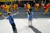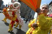 【明慧网2004年4月27日】4月10日(星期六)数千名法轮功学员在纽约曼哈顿的中国城举行了盛大的游行活动。本次游行分有九大方队,分别讲述不同的故事,从法轮功面世、洪传到被镇压、在世界弘扬等等。现场气氛令人感动。这次游行是在纽约召开的2004年法轮功心得交流会的一部份,创始人李洪志先生于11日亲临交流会现场演讲,整个大会有4千多人参加。 http://www.time.com/time/potw/20040416/ 上图:法轮功学员游行中所展示的中国传统服饰和舞蹈等令许多观众称赞。时代杂志的网络版把当天的这张游行照片选为它的“一周图片”(Pictures of the Week)之一。 舞狮和老人 |  法轮功学员的腰鼓队走过,路边一名小男孩随之起舞 |