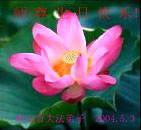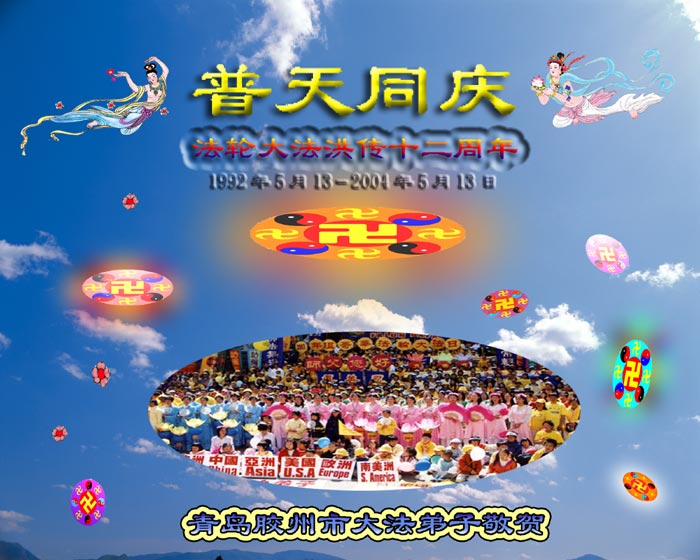山东莱芜市全体大法弟子庆贺法轮大法洪传十二周年暨2004年5月13日世界法轮大法日,并向伟大的师尊问候:师父好。 悠悠一瞬十二载, 正法金莲天地开。 三件大事不懈怠, 圆容大穹成住在。 莱芜大法弟子 2004年5月9日 山东省大法弟子向师尊问好