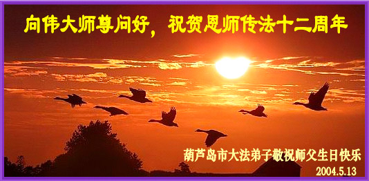 祝师父生日快乐。 我们无论在何方都会做好三件事,救度更多的有缘人。 2004年5月16日 葫芦岛市建昌县大法弟子恭祝慈悲伟大的师尊生日快乐!并祝贺第五届世界法轮大法日!