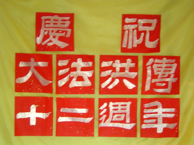 东莞大法弟子敬祝 山东大法弟子制作的庆祝世界法轮大法日的横幅
