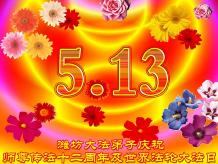 五一三 十二年前的这一天, 暗暗旧宇中划开了亮丽的一幕, 慈悲的师尊开始了宇宙大法在人世间的洪传。 本该毁灭的众生有了生的希望, 有缘的一切也都有了美好的新开端。 五一三 普天同庆层层众生齐颂赞, 幸运的大法弟子有缘随师正法行, 倾心尽力做好三件大事,唯愿师尊展笑颜。   山东潍坊全体大法弟子 2004年5月13日 哈尔滨市全体大法弟子恭祝慈悲伟大的师父生日快乐!