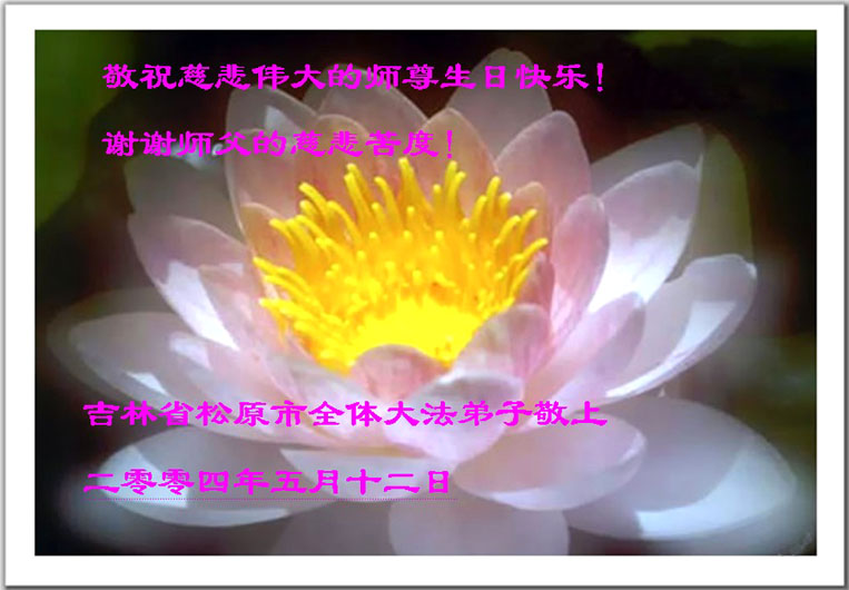 恭祝师尊生日快乐! 普天同庆,沐浴佛光,佛恩浩荡,无言以报,唯有精進,精進,“明析不足再精進”(《洪吟(二)》),理智清醒做好三件事,不负师父苦度,不忘众生所盼,走正、走好最后的路。 师尊,您辛苦了,放心吧,弟子一定会做好! 2004年5月13日 吉林德惠市全体大法弟子热烈祝贺5.13世界法轮大法日